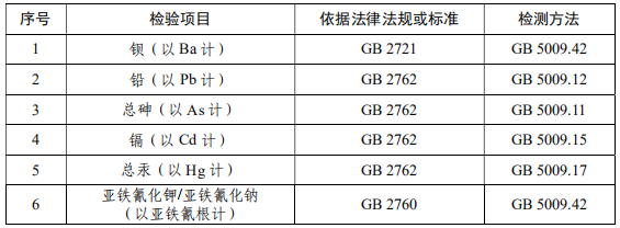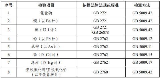 GB 2721 食品安全國家標準 食用鹽 GB 2760 食品安全國家標準 食品添加劑使用標準 GB 2762 食品安全國家標準 食品中污染物限量 GB 5009.11 食品安全國家標準 食品中總砷及無機砷的測定 GB 5009.12 食品安全國家標準 食品中鉛的測定 GB 5009.15 食品安全國家標準 食品中鎘的測定 GB 5009.17 食品安全國家標準 食品中總汞及有機汞的測定 GB 5009.42 食品安全國家標準 食鹽指標的測定 GB 26878 食品安全國家標準 食用鹽碘含量