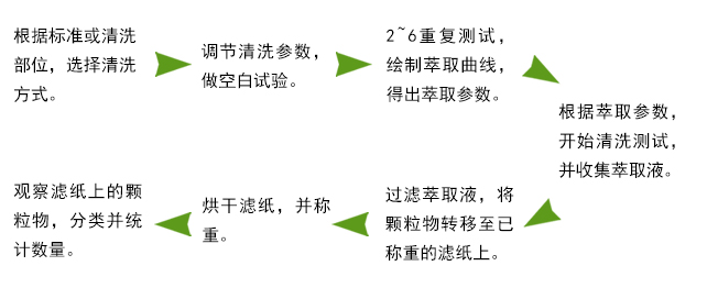 使用某種或多種機(jī)械方法,通過清洗液在規(guī)定的時(shí)間內(nèi),把污染物從樣品上分離到清洗液中,最終把萃取液過濾到測試濾膜上,分析濾膜上的顆粒重量、數(shù)量、性質(zhì)等。